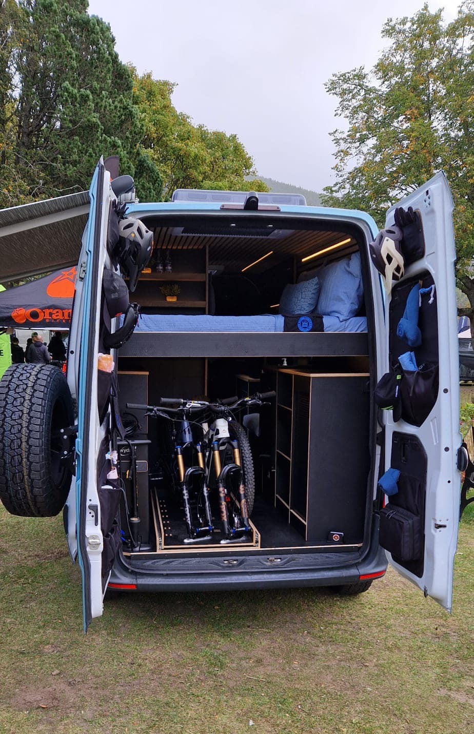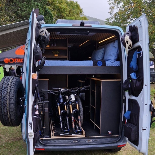 This isn’t a generic camper layout. It’s a purpose-built adventure platform designed around how mountain bikers actually travel — secure gear storage, practical cleaning solutions, serious off-grid performance, and durable finishes throughout.