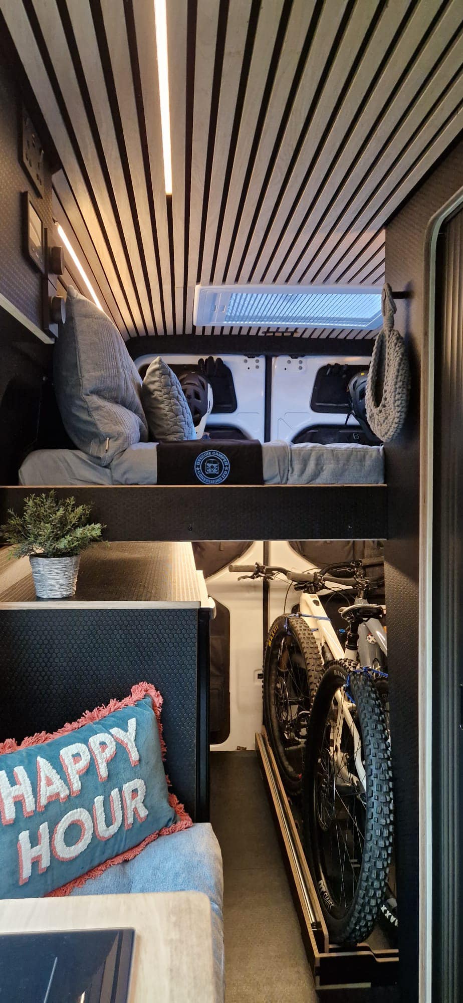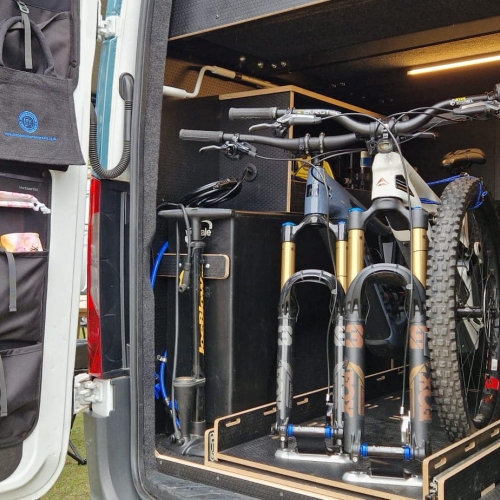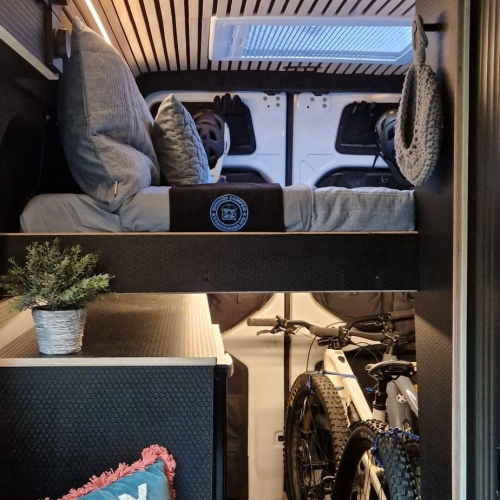 This isn’t a generic camper layout. It’s a purpose-built adventure platform designed around how mountain bikers actually travel — secure gear storage, practical cleaning solutions, serious off-grid performance, and durable finishes throughout.